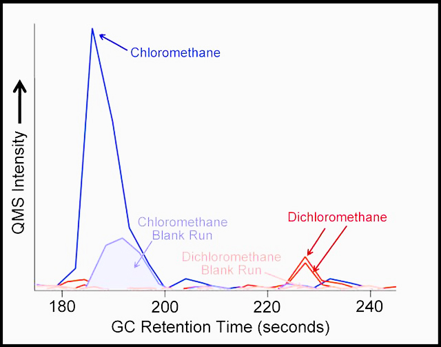 There. Are you suitably impressed by methylene chloride’s potential for nastiness? So, have a look at the data plot radioed back from Mars by the rover. It would seem that methylene chloride (labeled Dichloromethane) permeates the soil, at least in the spot the rover has been investigating. Oh, and I’ve neglected to mention an even larger contamination with methylene chloride’s cousin, chloromethane. Trust me, it’s nasty stuff too, as are the two other members of this family of carbon-chlorine compounds, carbon tetrachloride and that old nemesis of the murder-mystery genre, chloroform, which goes by the scientific name of trichloromethane.